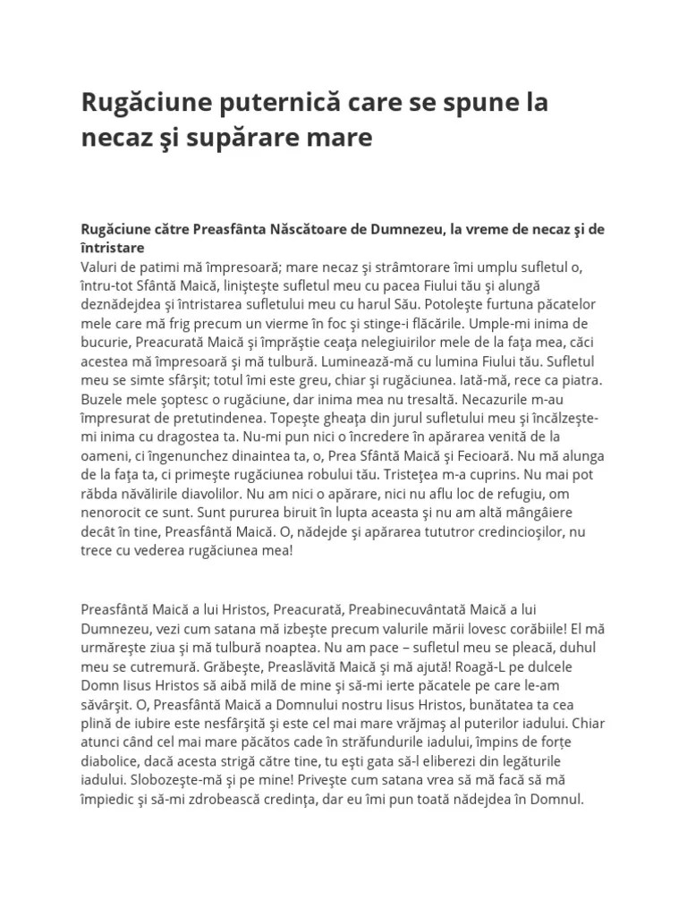 Rugăciune către preasfânta născătoare de dumnezeu, la vreme de necaz şi de întristare... Dar, deși sufăr, nu cârtesc, preabunule, de vreme ce tu ești întotdeauna sprijinitorul meu și piatra cea neclintită, pe care sunt întemeiate nădejdile mele. Doamne, norii grei ai nenorocirilor se îngrămădesc asupra capului meu și întristările chinuitoare mă îngrozesc. Fa aceasta rugaciune la vreme de necazu. Rugaciune catre sfantul proroc ilie, la vreme de seceta; 21.05.2012 · rugaciune la necazuri si suparari. Rugăciune la necazuri şi supărări.
